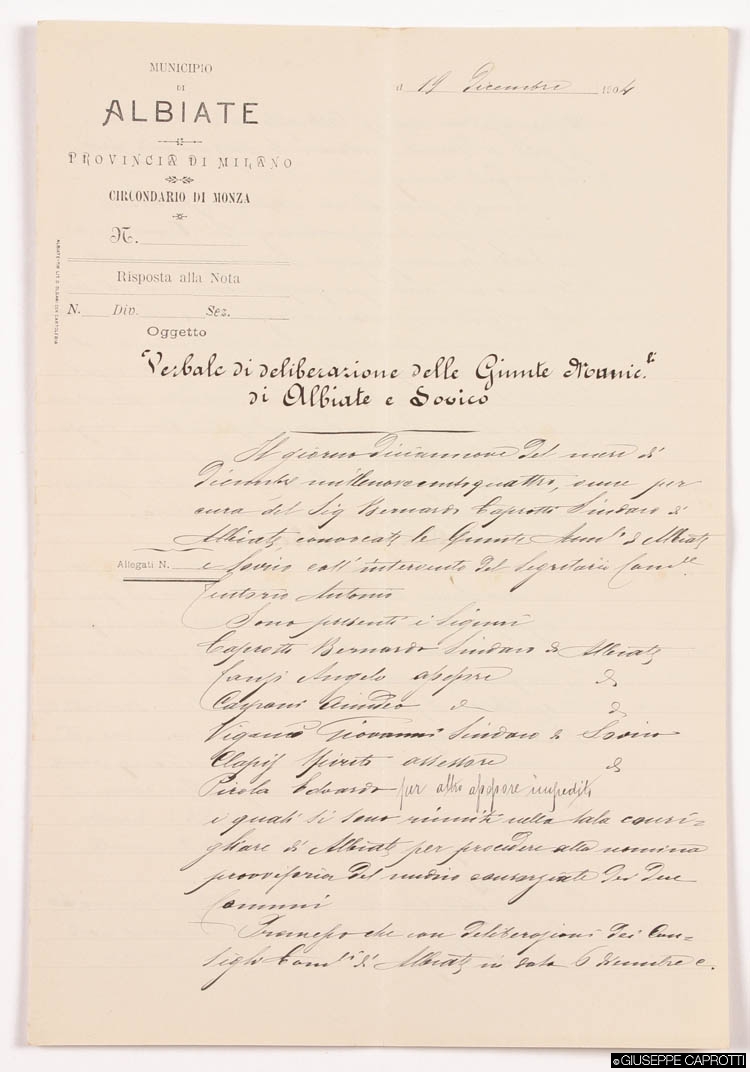 24 1904 dicembre 19, Albiate Copia di verbale di deliberazione delle Giunte municipali di Albiate e Sovico per la nomina provvisoria del medico consorziato (sindaco di Albiate: Bernardo Caprotti) mm. 210×310