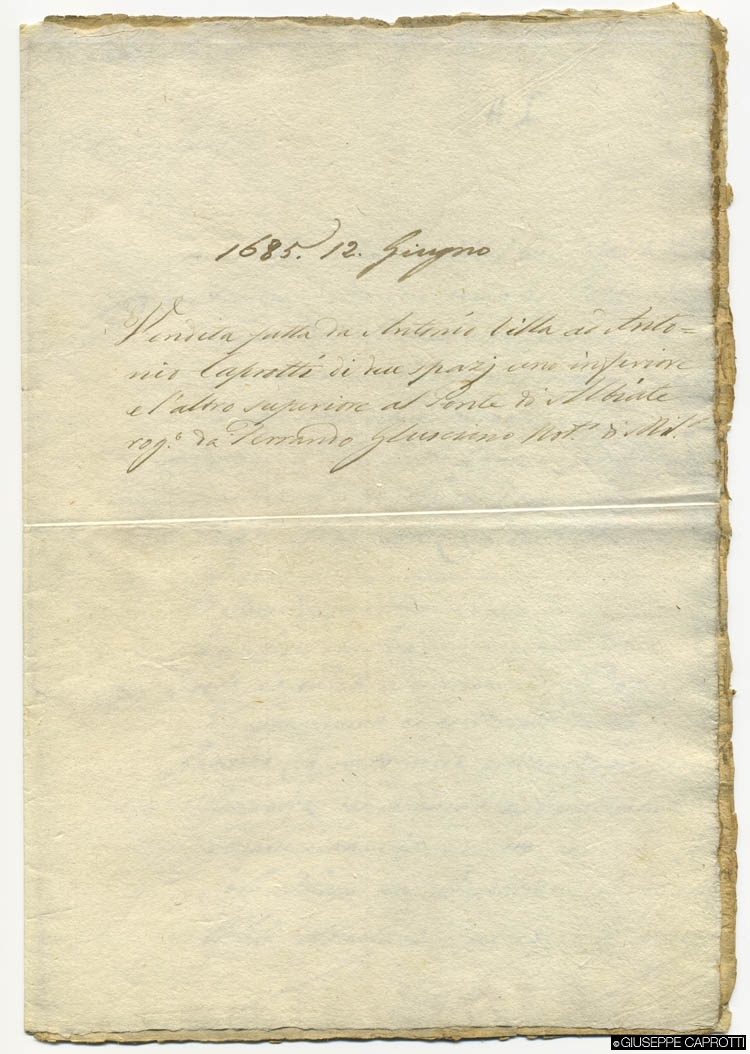 25 1685 giugno 12, Rancate Vendita fatta da Antonio Villa ad Antonio Caprotti di due spazi uno inferiore e l’altro superiore al Ponte di Albiate, rogata da Ferrando Glusciano not[ai]o di Mil[an]oCopia autentica di atto notarile, cartaceo, mm. 280×195, ff. 4Antonio Villa del fu Battista, di Ponte Albiate pieve di Rancate, vende ad Antonio Caprotti del fu Giovanni Battista due loca (spazi), uno sito al piano superiore e uno al piano inferiore, con una porzione di terreno ove sorgono alcune piante di gelso, sito nello stesso luogo di Ponte Albiate.