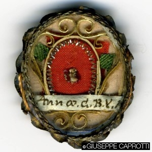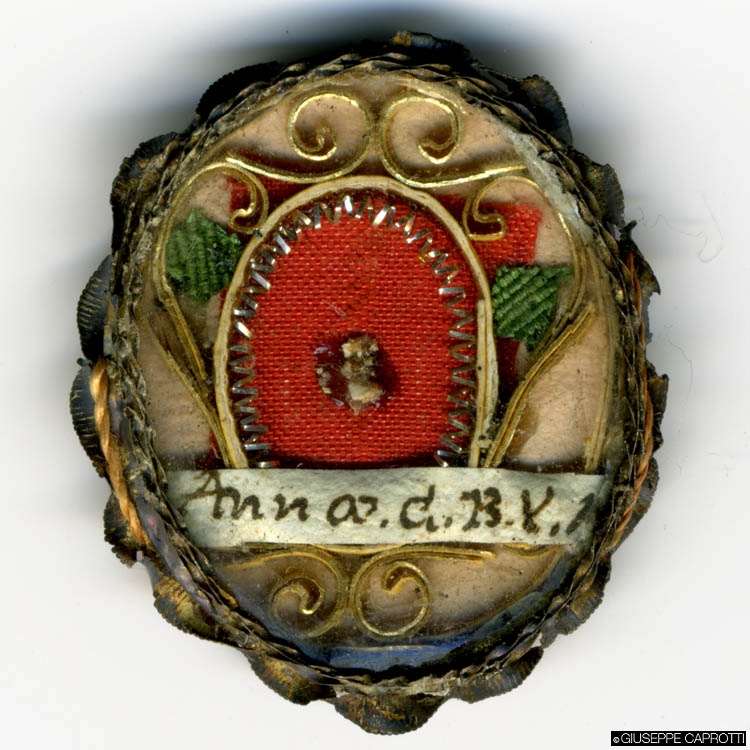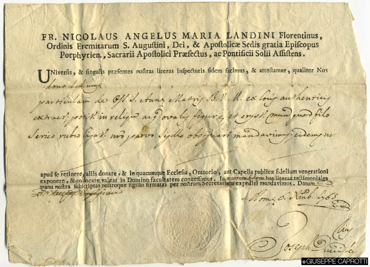 27 1765 novembre 6, Roma Reliquia di Sant’Anna, madre della Vergine Maria, e relativo certificato di autenticità Cartaceo, mm. 265×195; teca in argento, oro, seta e cristallo, mm. 35×23 Tra le antiche carte Caprotti è stata ritrovata questa minuscola reliquia, munita di certificato di autenticità. La teca che la racchiude è un piccolo gioiello in perfette condizioni, montata in argento, oro, seta e cristallo molato, con cartiglio identificativo (Annæ m[ater] B[eatæ] V[irginis] M[ariæ]) ancora perfettamente leggibile, e sigillata con filo serico fissato sul retro mediante bollo di ceralacca integro.