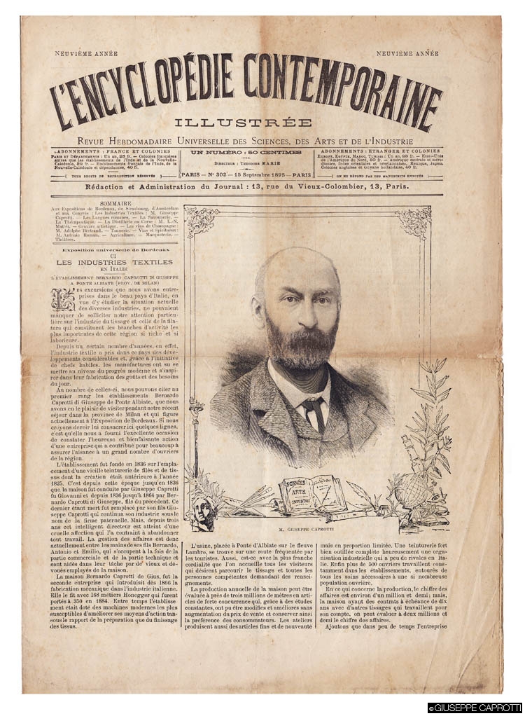 28 1895 settembre 15, ParigiV. Dumesnil, L’établissement Bernardo Caprotti di Giuseppe à Ponte Albiate (Prov. De Milan), dans «L’Encyclopédie Contemporaine illustrée», Paris, 15 settembre 1895 [La ditta Bernardo Caprotti di Giuseppe a Ponte Albiate, provincia di Milano, in «L’enciclopedia contemporanea illustrata», Parigi, 15 settembre 1895]Cartaceo, mm. 400x320L’articolo fa parte di una serie scritta sulle industrie tessili in Italia, in occasione dell’Esposizione universale di Bordeaux dove la Caprotti era presente con un proprio stand. L’azienda veniva definita di primo piano, e il giornalista rimarcava immediatamente, per averlo constatato di persona durante una sua visita, il felice e benefico influsso ch’essa aveva nel contribuire ad assicurare il benessere a un gran numero di operai della regione. Fu la seconda impresa a introdurre la fabbricazione meccanica nell’industria italiana, nel 1866, ed era tuttora dotata dei più moderni mezzi di produzione, che i proprietari, i figli di Giuseppe (del quale è pubblicata la fotografia), facevano visitare con “franca cordialità” a tutti i visitatori che desiderassero conoscere il percorso della tessitura moderna. Le cifre della produzione – quasi tre milioni di metri di stoffa all’anno a prezzi di forte concorrenza, sempre migliorati e aggiornati senza aumentarne i prezzi al consumo –, il reparto di tintoria, uno dei punti di maggior forza, più di 500 operai impiegati stabilmente nelle migliori condizioni di lavoro e un fatturato di circa due milioni e mezzo ne facevano un’organizzazione industriale che, a detta del giornalista, aveva pochi rivali in Italia. Nonostante i successi, i proprietari avevano deciso di evitare qualunque genere di pubblicità invadente o aggressiva, e di non partecipare che a pochissime esposizioni sia lombarde sia internazionali, potendo così vantare solo poche distinzioni di merito, anche se di valore: la medaglia d’argento all’Esposizione provinciale di Monza nel 1871, la medaglia d’oro all’Esposizione agricola e industriale di Como del 1872, la medaglia d’argento all’Esposizione nazionale di Milano nel 1881 e infine la medaglia d’argento all’Esposizione internazionale di Bordeaux di quell’anno. La Caprotti sarebbe stata presente anche all’Esposizione di Atlanta, allora in preparazione, grazie alle numerose esportazioni dei suoi prodotti nel Nuovo Mondo. Là – il giornalista ne era certo –avrebbe certamente ricevuto la definitiva consacrazione che un’azienda, la quale dava il maggior lustro possibile all’industria del suo paese, aveva il diritto di aspettarsi.