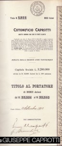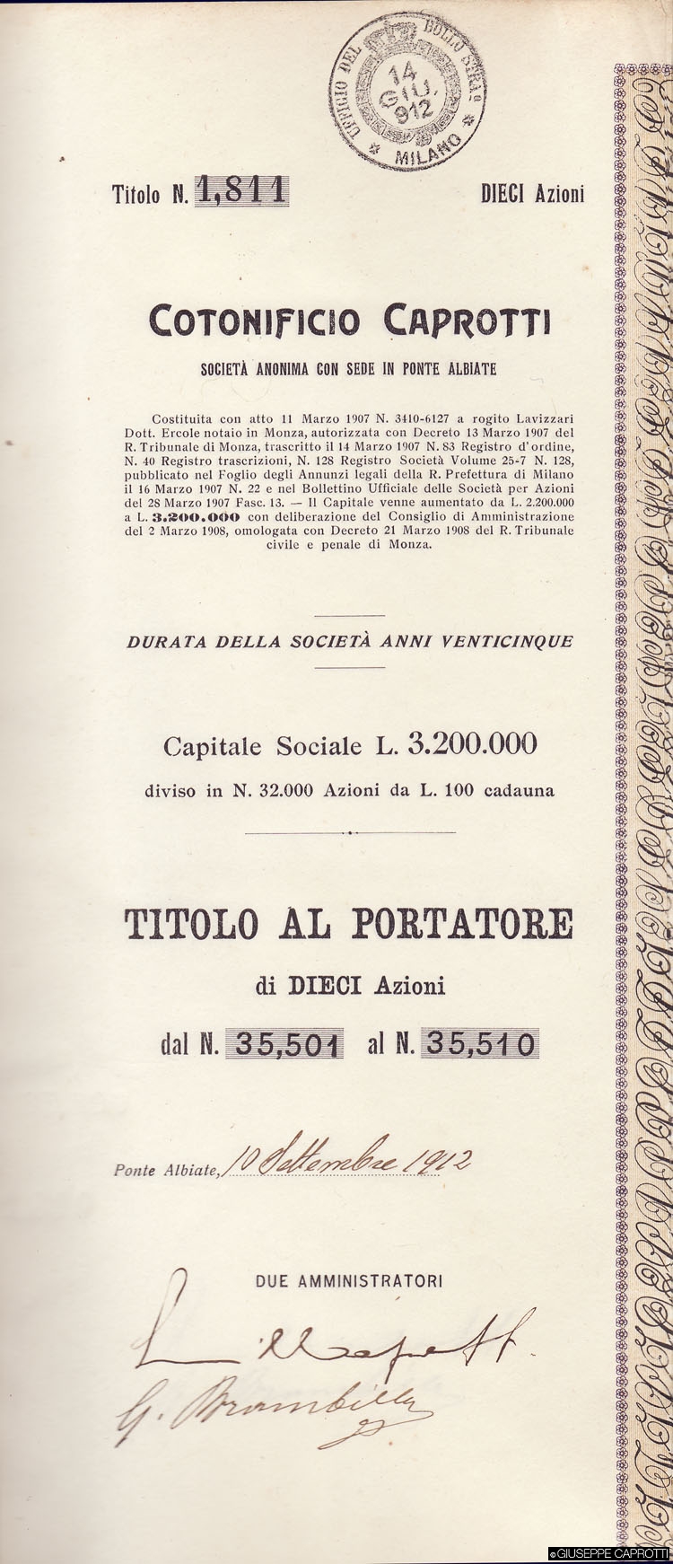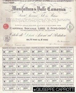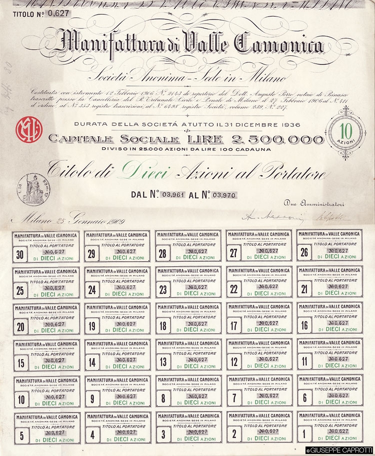 31 [1906– 1917] Manifattura di Valle Camonica, Titolo di 10 azioni al portatore; 1909 Impresa fondata da Bernardo Caprotti, concorrente della manifattura Caprotti (di cui Bernardo rimase azionista) gestita dal fratello Emilio.La manifattura di Valle Camonica venne liquidata tra il 1913 e il 1917.