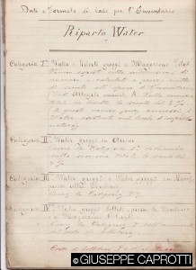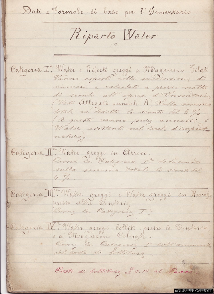 29 [1893 – 1896]  Dati e formule di base per l’inventario Cartaceo, mm. 301x221Si tratta delle istruzioni interne per l’esposizione dei filati e la compilazione dell’inventario di magazzino dell’azienda Caprotti alla fine del XIX secolo. Questa pagina in particolare riguarda il Riparto Water, ossia i filati di cotone a singolo capo (denominati, per l’appunto, water).