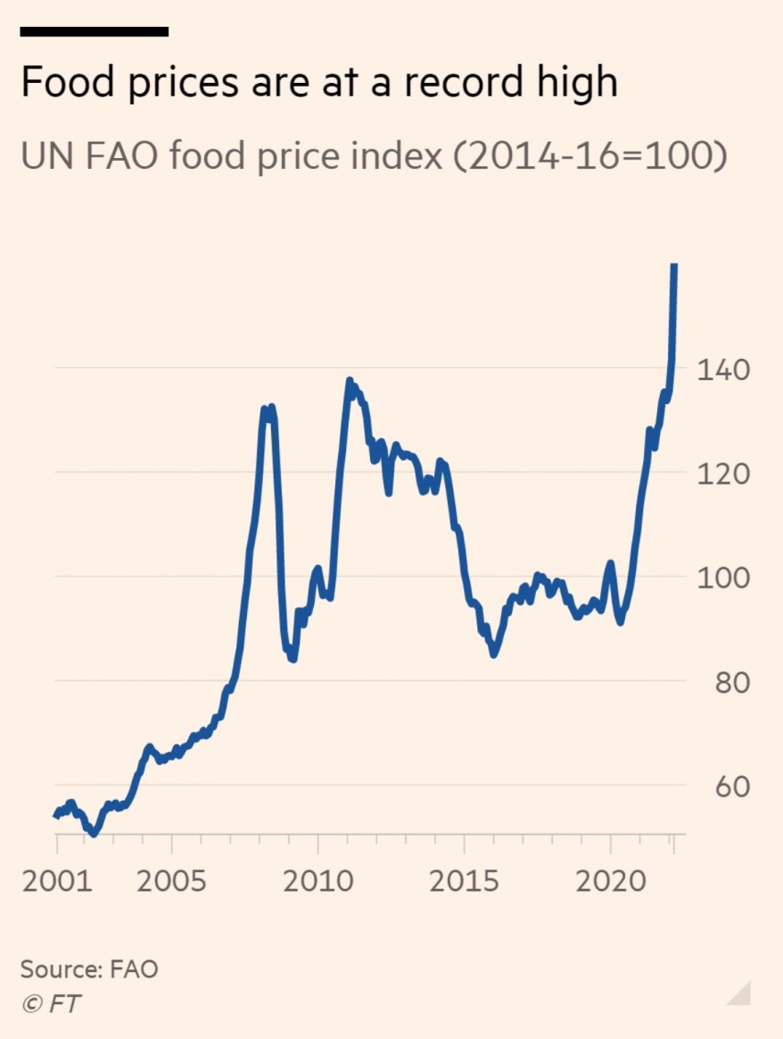 I prezzi alimentari mondiali hanno raggiunto un nuovo record dovuto all’impatto della guerra in Ucraina