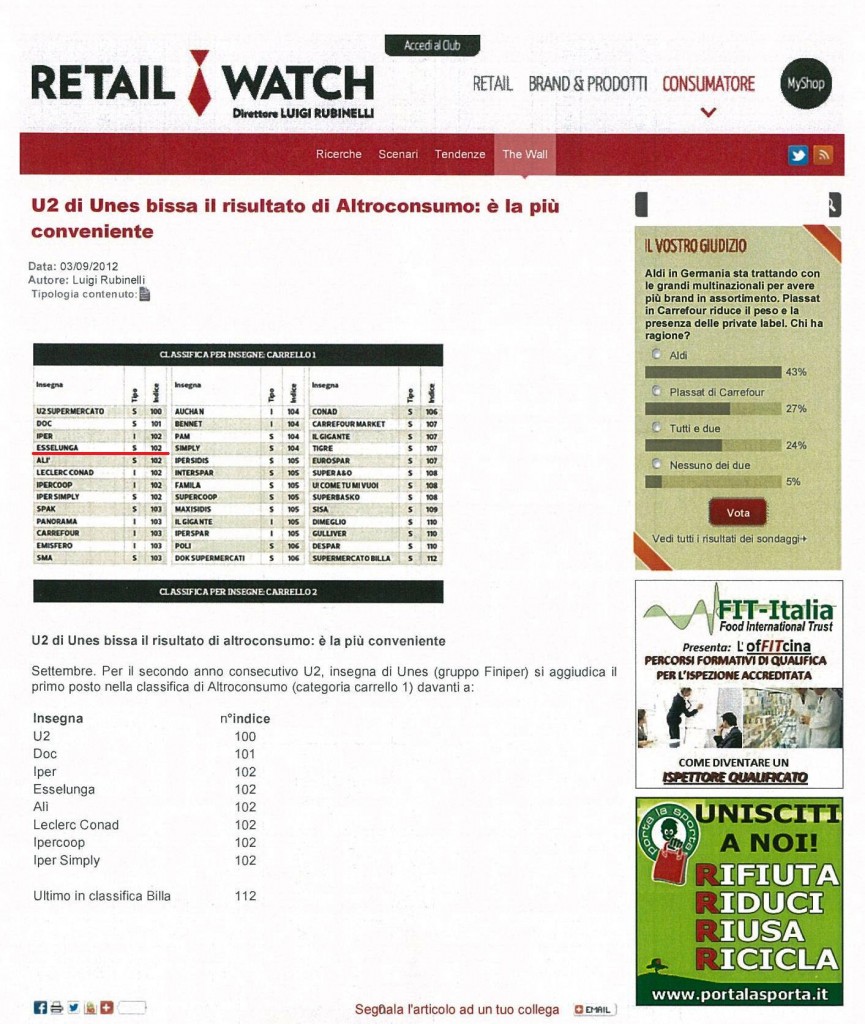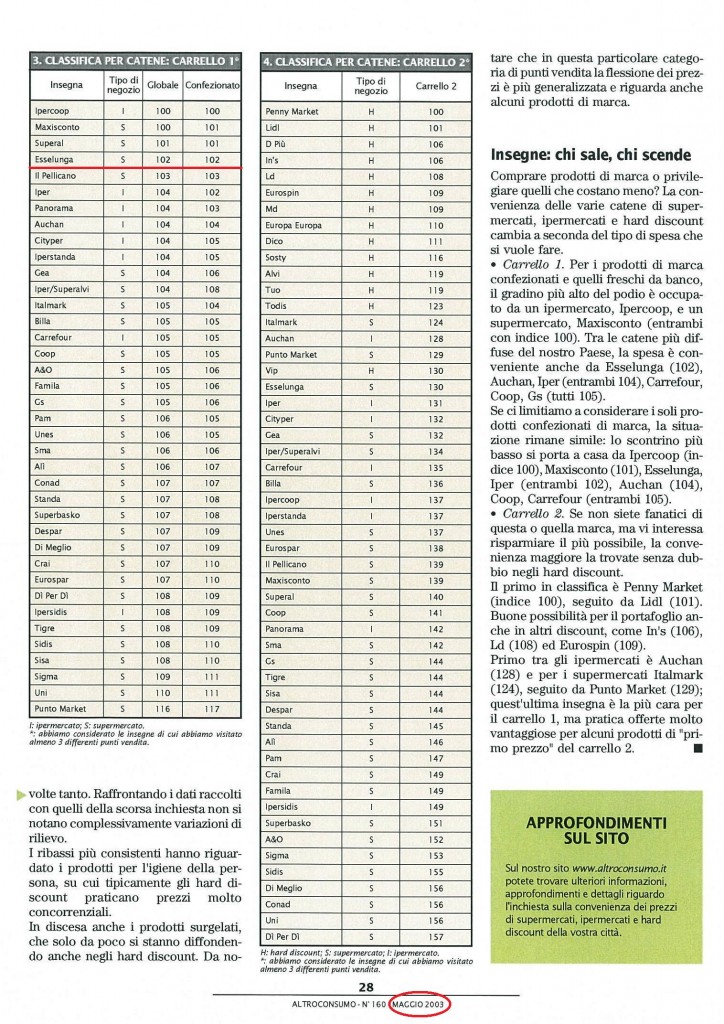 Questi sotto erano gli indici di prezzo delle varie catene della GDO, tra le quali Esselunga nel 2003.