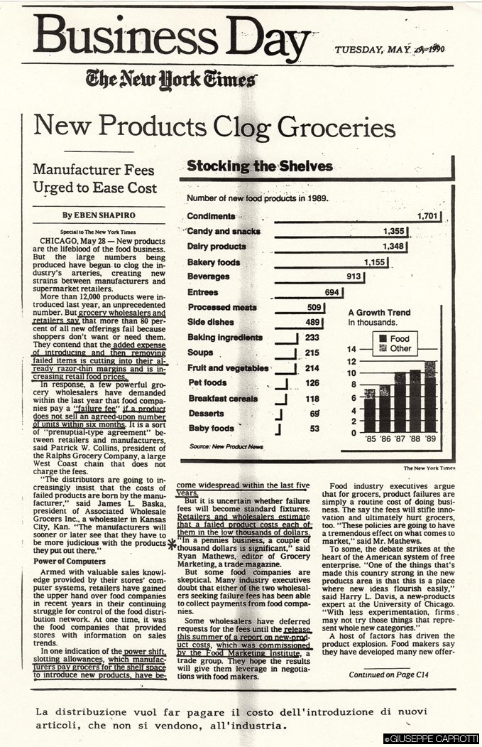 Le innovazioni finiscono spesso per alimentare le fila dei prodotti di poco successo: oltre due terzi dei nuovi prodotti rimangono marginali sul mercato e molti scompaiono dagli scaffali dopo pochi mesi. Solo l’1% dei nuovi prodotti ottiene un discreto successo e riesce a guadagnare una diffusione nazionale.