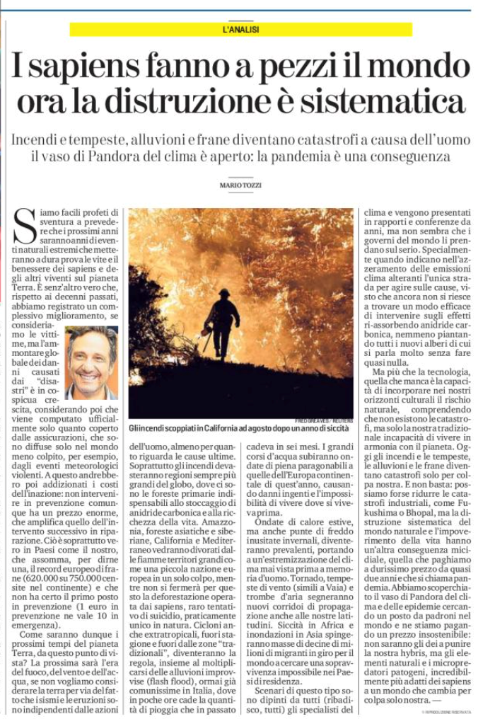I sapiens fanno a pezzi il mondo ora la distruzione è sistematica, La Stampa 28 dicembre 2021