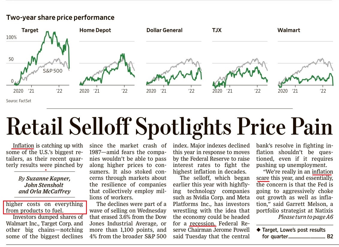 Sotto : la prima pagina del Wall Street Journal del 19 maggio 2022 che cita come ragioni per il crollo: paura dell’inflazione e recessione.