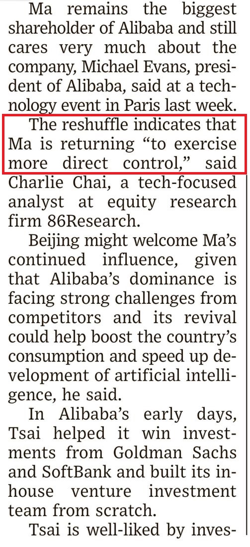 Il rimpasto (reshuffle), secondo alcuni analisti, rinforza Jack Ma che detiene ancora il 6% delle azioni del gruppo.