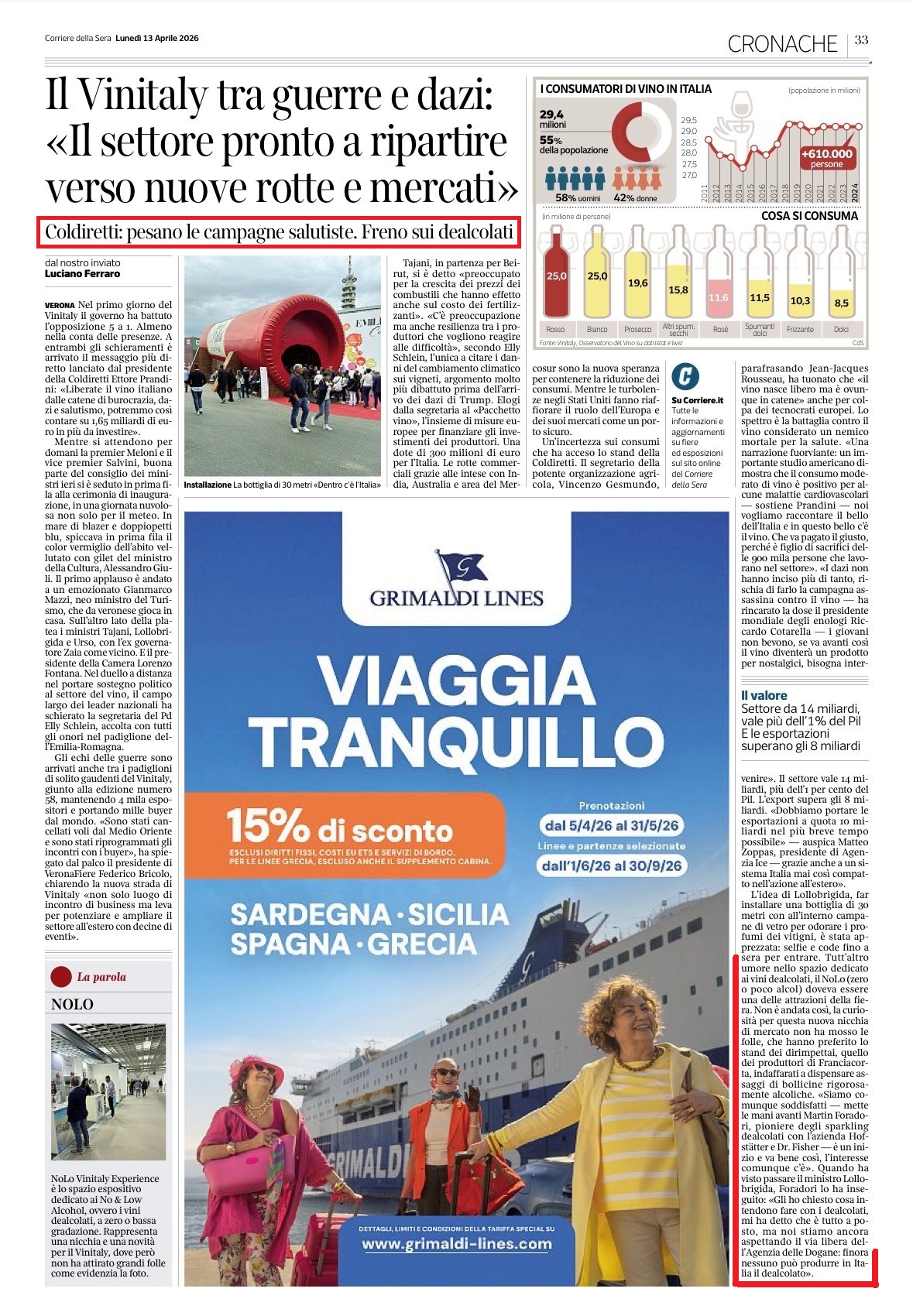 Sotto : Coldiretti , come sulle rinnovabili, fa un battaglia ideologica sul vino dealcolato che “finora nessuno può produrre in Italia” (anche se un decreto è stato firmato a dicembre 2025).