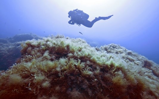 Un plongeur observe les algues filamenteuses près de l’île de Porquerolles, en juin 2015. Ces algues ont largement proliféré à cause du réchauffement climatique, étouffant le reste de la flore sur le côtes méditerranéennes.