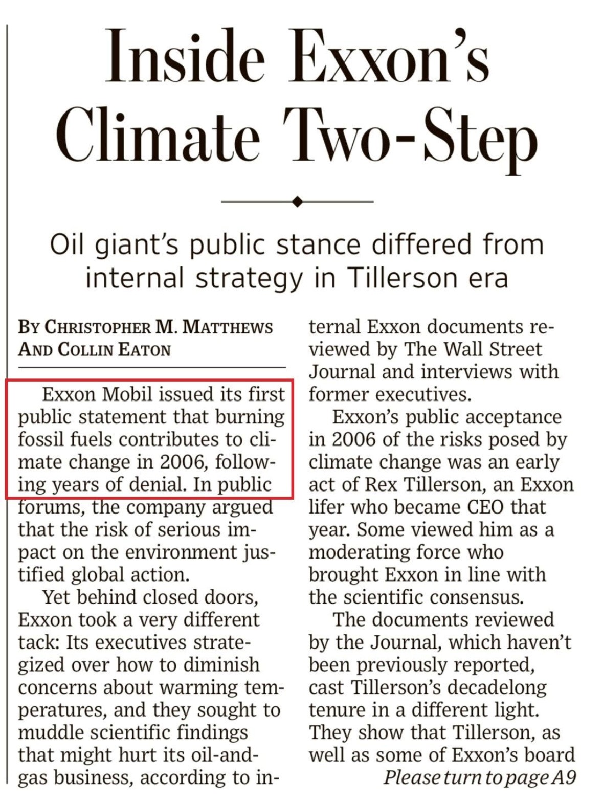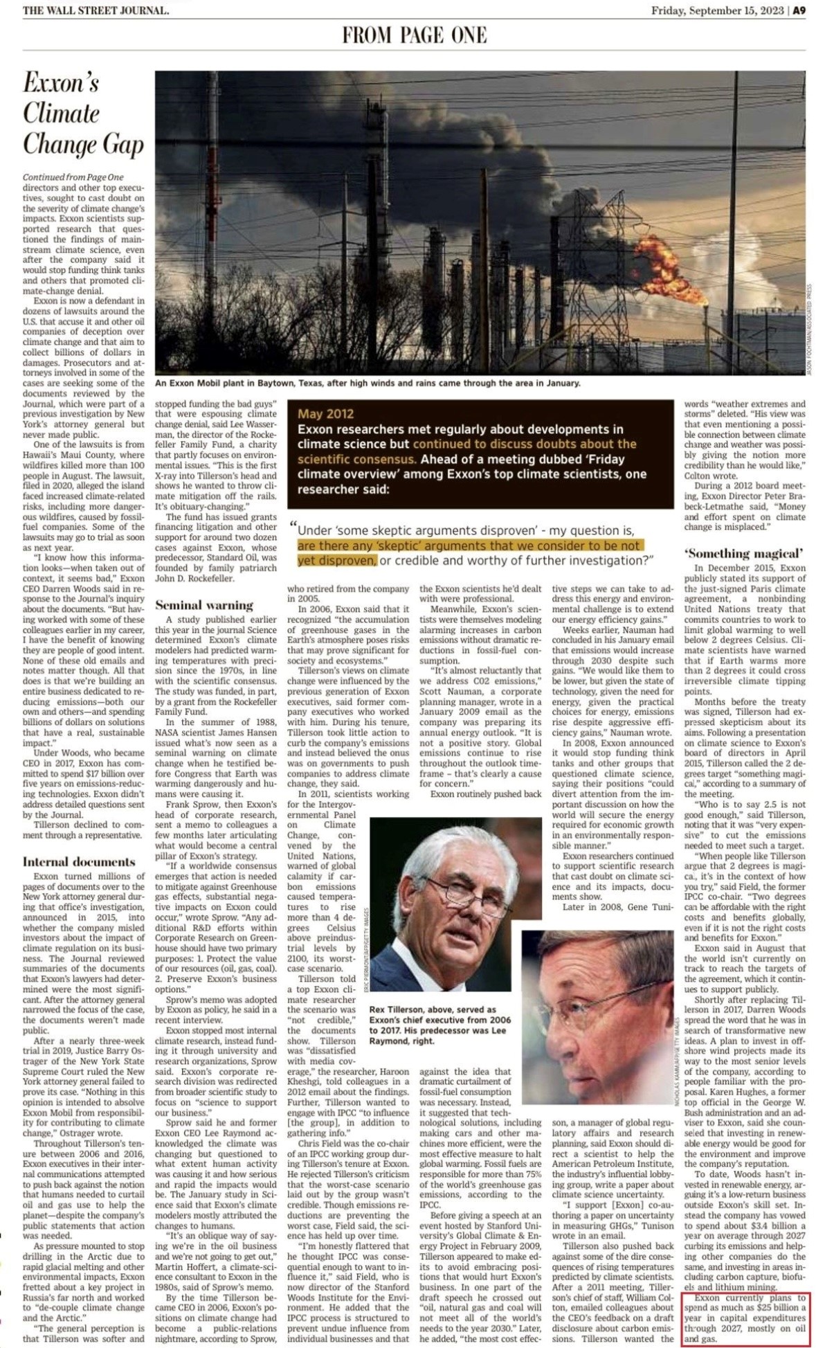 Sotto : Exxon ammette – su The Wall Street Journal del 15 settembre 2023 – che era a conoscenza del contributo delle enrgie fossili al cambiamento climatico, dopo aver negato per anni.
