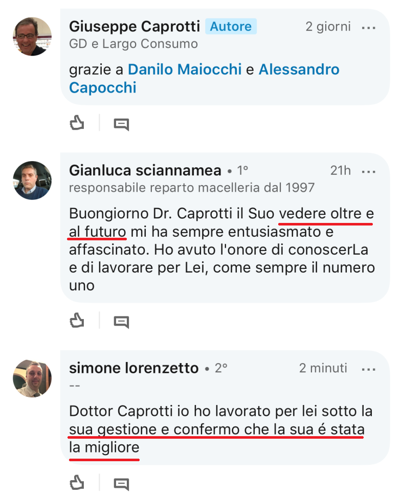 - “il suo vedere oltre il futuro mi ha sempre entusiasmato e affascinato. Ho avuto modo di conoscerLa e di lavorare per Lei, come sempre il numero uno” Gianluca Sciannamea