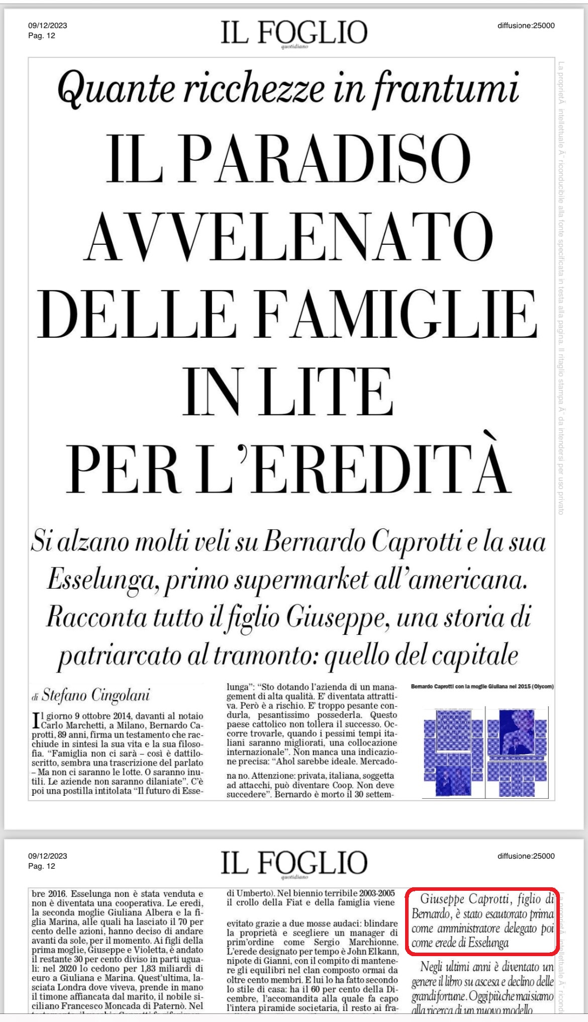 Nota finale : “Giuseppe Caprotti, figlio di Bernardo, è stato esautorato prima come amministratore delegato poi come erede di Esselunga”: Cingolani ha ragione, Marina e Giuliana Caprotti sono state nominate eredi universali da mio padre Bernardo. Violetta ed io siamo legatari, c’è una grossa differenza tra eredi e legatari, su tanti aspetti.