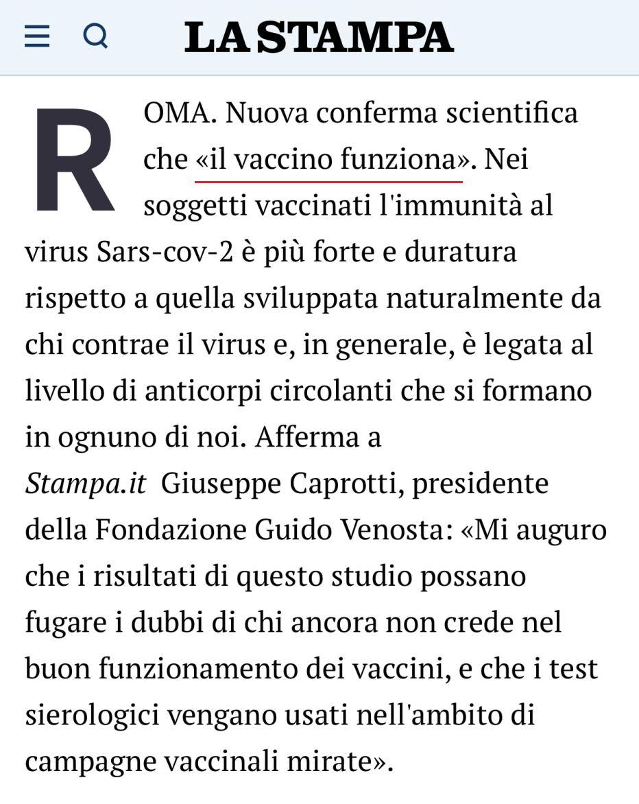 Nei soggetti vaccinati l’immunità al virus Sars-cov-2 è più forte e duratura rispetto a quella sviluppata naturalmente da chi contrae il virus e, in generale, è legata al livello di anticorpi circolanti che si formano in ognuno di noi. Afferma a Stampa.it Giuseppe Caprotti, presidente della Fondazione Guido Venosta: «Mi auguro che i risultati di questo studio possano fugare i dubbi di chi ancora non crede nel buon funzionamento dei vaccini, e che i test sierologici vengano usati nell’ambito di campagne vaccinali mirate». E aggiunge: «Lo spirito che ha animato il programma si basa sull’importanza della ricerca scientifica il cui scopo è migliorare le condizioni di vita dell’uomo. La ricerca ha sempre fatto parte del dna della mia famiglia. Mio nonno, Guido Venosta, è stato infatti uno degli artefici dell’Airc (Associazione italiana per la ricerca sul cancro), che ha gestito dal 1966 al 1996.