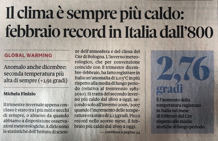 (1) “Giuseppe Miserotti, membro dell’Associazione Medici per l’Ambiente (ISDE), ha evidenziato come i picchi delle epidemie diventate più famose, come per esempio la SARS e l’influenza Aviaria nel 2003 e l’influenza Suina nel 2009, si siano verificati in corrispondenza di picchi di temperature di almeno 0,6 o 0,7 gradi oltre la media”.