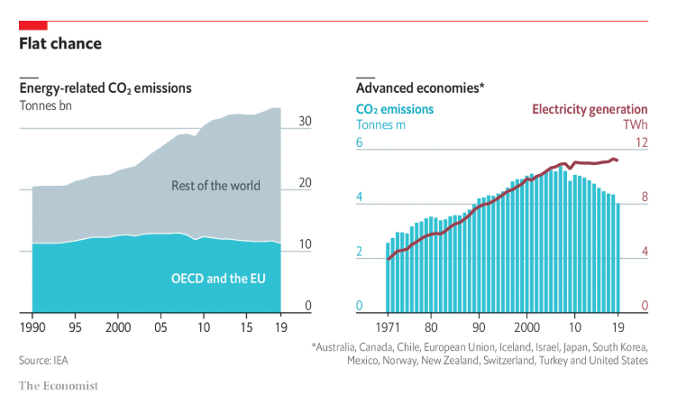Le emissioni (1), grazie ai paesi ricchi (che usano meno carbone e utilizzano più energie rinnovabili) sono “piatte” (flat, vedi schemi sotto (2)).