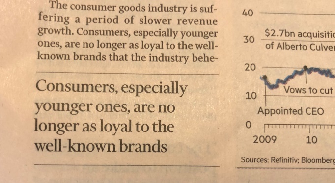 E il Financial Times, il 30 Novembre 2018, ha stigmatizzato i problemi delle grandi marche , parlando gel cambio della guardia dell’ad di Unilever, da Paul Polman a Alan Jope, e affermando che il nuovo CEO riceve in dote un’azienda con dei margini alti ma con una crescita delle vendite in discesa, sempre più problematica.