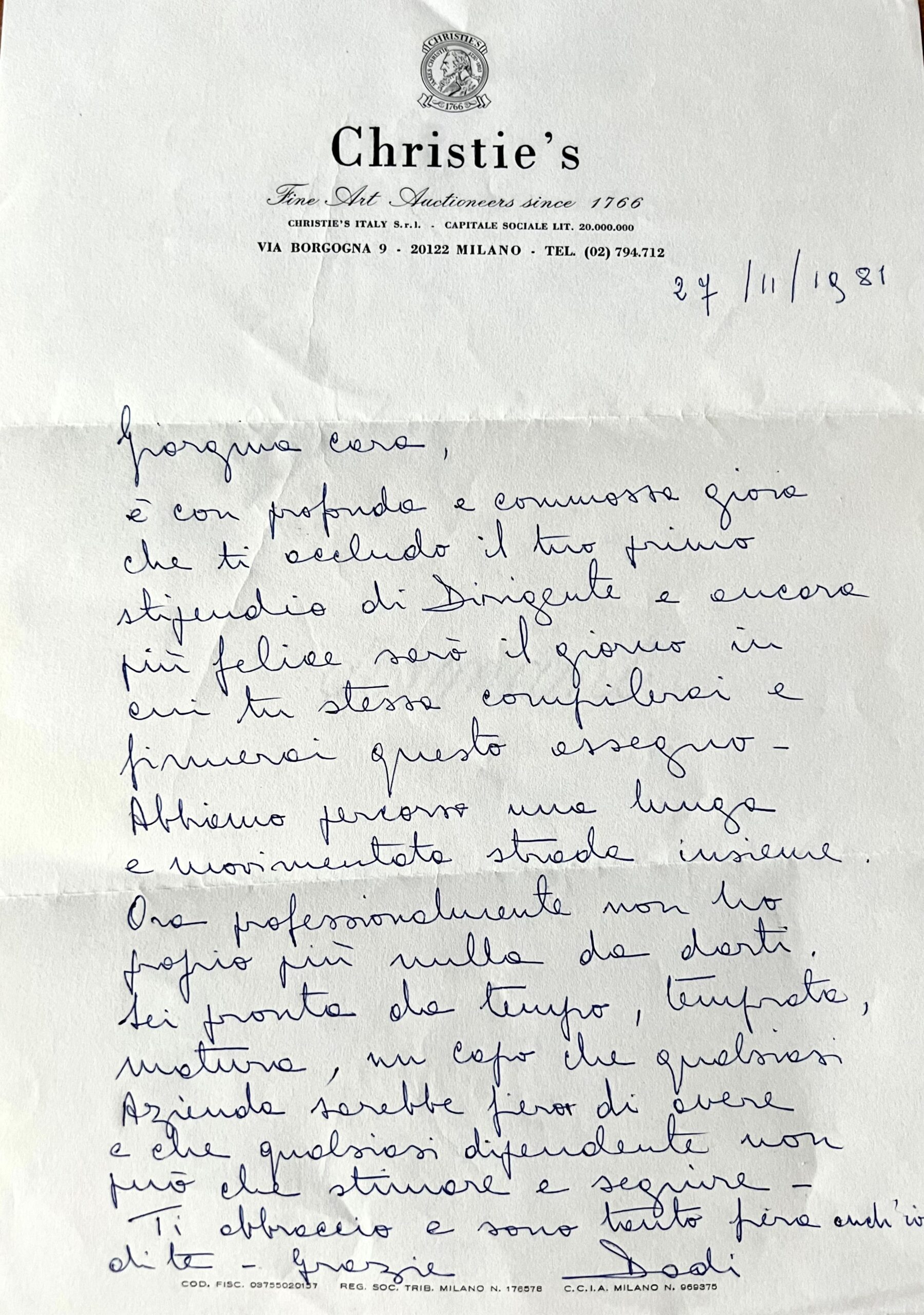 Di seguito la lettera del 27 novembre 1981 della signora Edoarda Sanna, detta Dadi, che le fece da mentore in Christie’s: