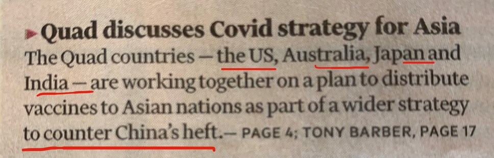 Nel contempo Joe Biden cerca alleati in Asia per uscire dall’isolazionismo in cui gli USA erano stati portati da Donald Trump e per contrastare il peso (heft, vedi sotto, fonte Financial Times del 4 marzo 2021 ) della Cina.