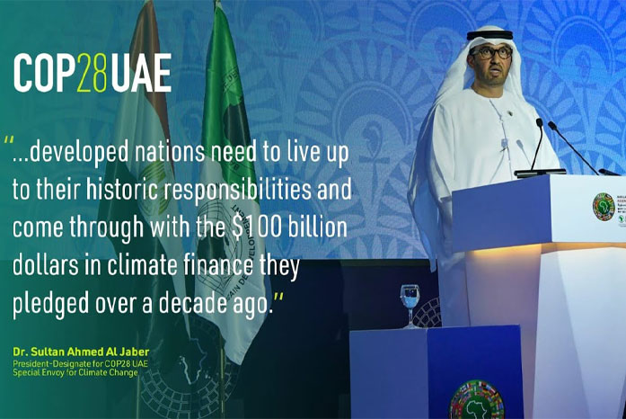Sotto : il presidente della conferenza COP28, che è anche a capo della Abu Dhabi National Oil Company, Sultan Ahmed Al Jaber, riprende i principi già esposti degli aiuti ai paesi più poveri.
