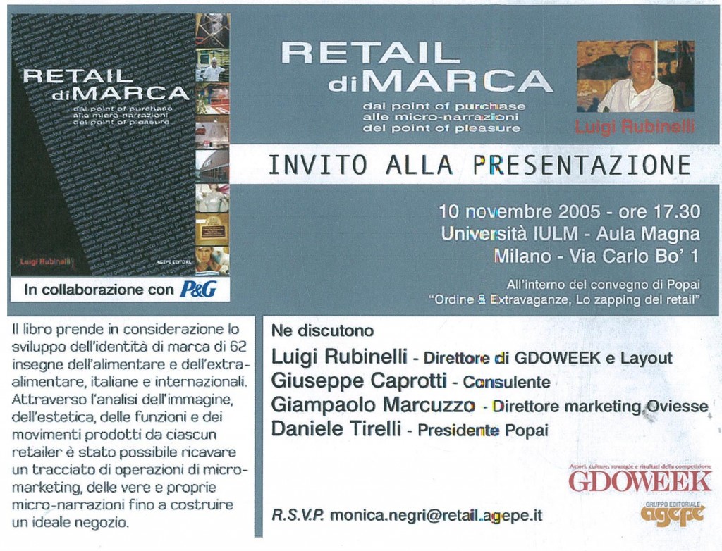 A fine 2005 il mio amico Luigi Rubinelli mi invitava a parlare ad una conferenza di presentazione del suo libro allo IULM di Milano, alla quale partecipava anche il dottor Daniele Tirelli, persona piacevole e stimata da molti nel Largo Consumo e nella GD.