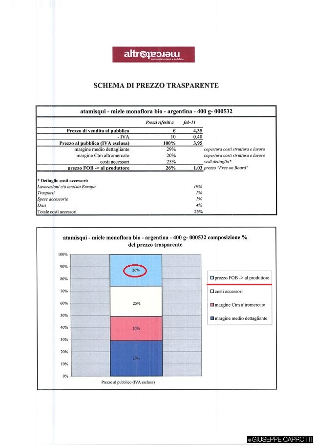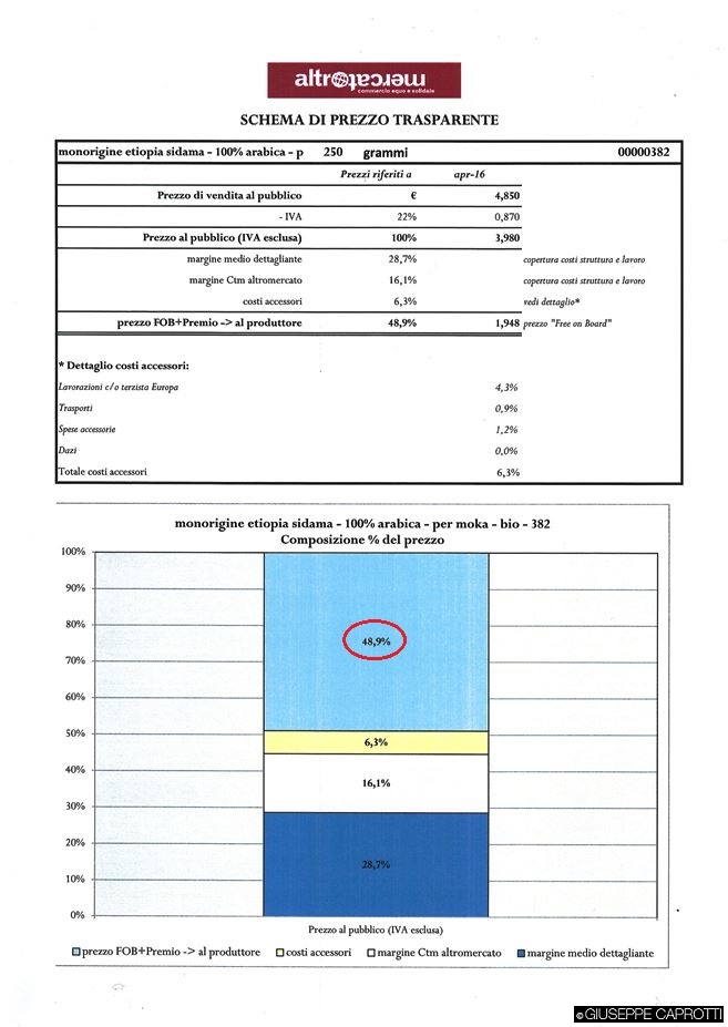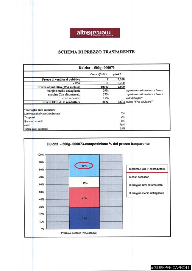 Altromercato lascia ai produttori tra il 26% e il 48,9% (*) del prezzo- al quale andrà aggiunta l’IVA- del prodotto che venderà nelle sue botteghe o alla GD .