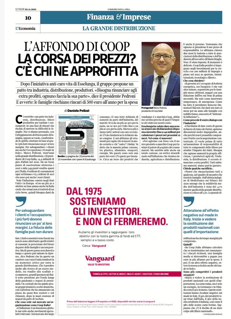 Ciò detto , Marco Pedroni , presidente di Coop Italia, è stato il protagonista dell’affondo sul Corriere Economia del 22 novembre 2021.