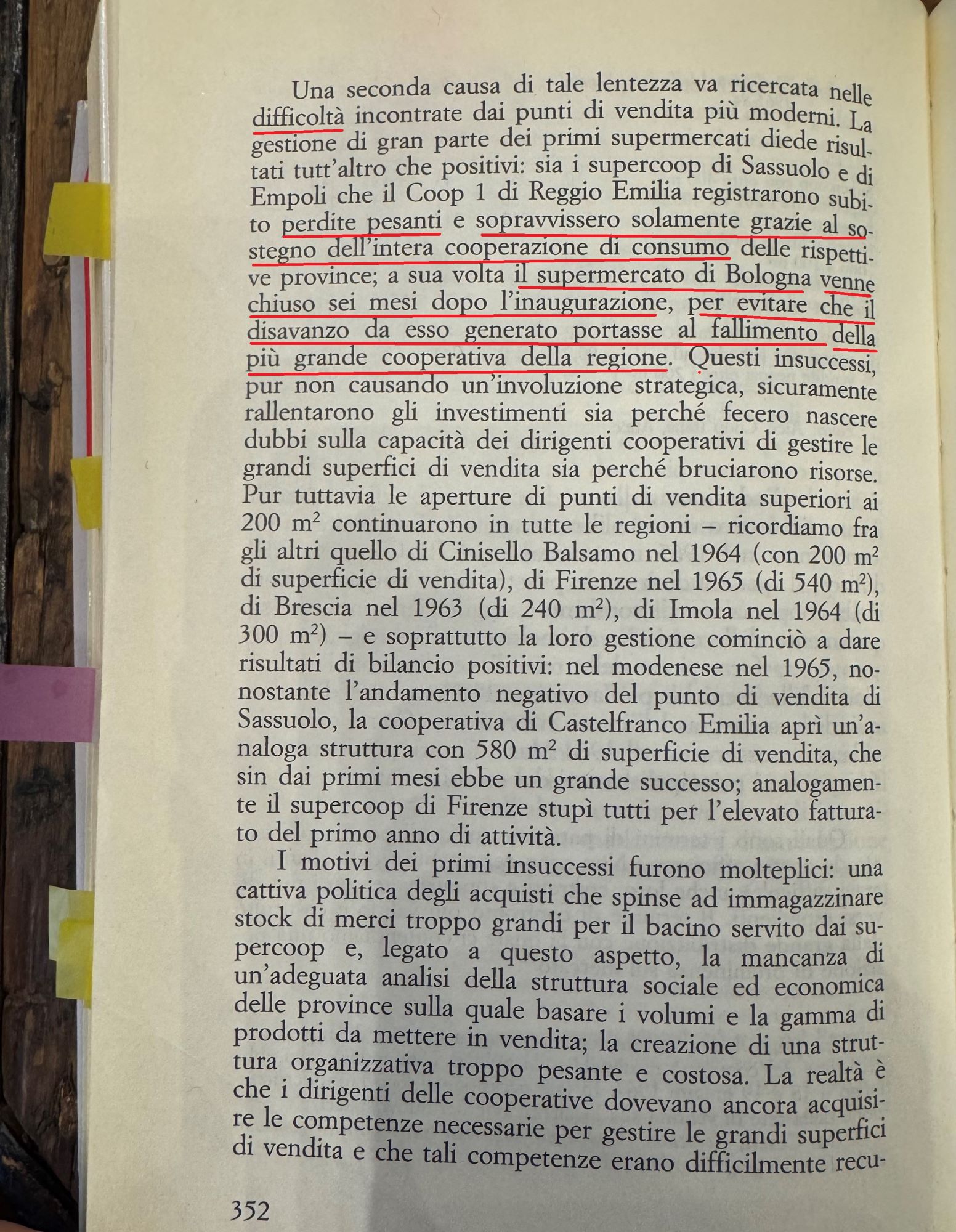 Una seconda causa di tale lentezza va ricercata nelle difficoltà incontrate dai punti di vendita più moderni. La gestione di gran parte dei primi supermercati diede risultati tutt’altro che positivi: sia i supercoop di Sassuolo e di Empoli che il Coop 1 di Reggio Emilia registrarono subito perdite pesanti e sopravvissero solamente grazie al sostegno dell’intera cooperazione di consumo delle rispettive province; a sua volta il supermercato di Bologna venne chiuso sei mesi dopo l’inaugurazione, per evitare che il disavanzo da esso generato portasse al fallimento della più grande cooperativa della regione. Questi insuccessi, pur non causando un’involuzione strategica, sicuramente rallentarono gli investimenti sia perché fecero nascere dubbi sulla capacità dei dirigenti cooperativi di gestire le grandi superfici di vendita sia perché bruciarono risorse.