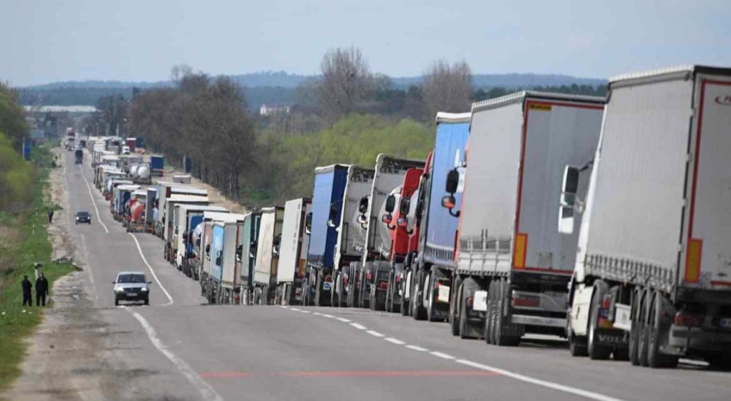 Sotto : camion di grano bloccati alla frontiera ucraina ad aprile 2023