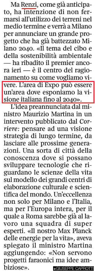 E Matteo Renzi ha dichiarato il 4 novembre 2015 al Corriere della Sera che esiste un progetto Milano 2040 e che “l’area di Expo può essere un’area dove esponiamo la visione italiana fino al 2040”
