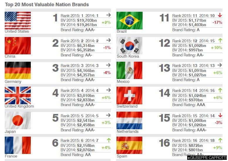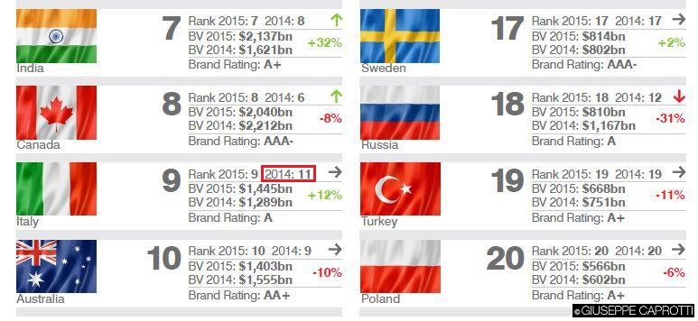 Il nostro Paese guadagna 2 posizioni rispetto al 2014 nel report di Brand Finance. Gli Usa ancora in testa, Cina e Germania al seguito ma in calo di valore.