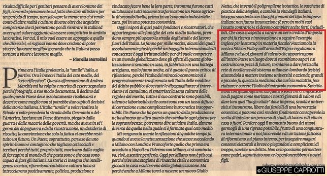 “che cosa si aspetta a varare un vero credito d’imposta per chi fa ricerca e innovazione a seguire l’esempio inglese per le start up in materia fiscale? Facciamola la nostra Silicon Valley nell’area dell’Expo e regaliamo a Milano e ai suoi giovani di talento che appartengono all’intero Paese un luogo dove si scambiano saperi e si costruiscono pezzi di futuro , torniamo a dare forza alla rete di eccellenze del sistema milanese- lombardo (esiste) aiutandola a mettere insieme università e aziende, grandi e piccole: fù questa la medicina che curò la la malattia, fece rialzare e correre l’Italia del miracolo economico”