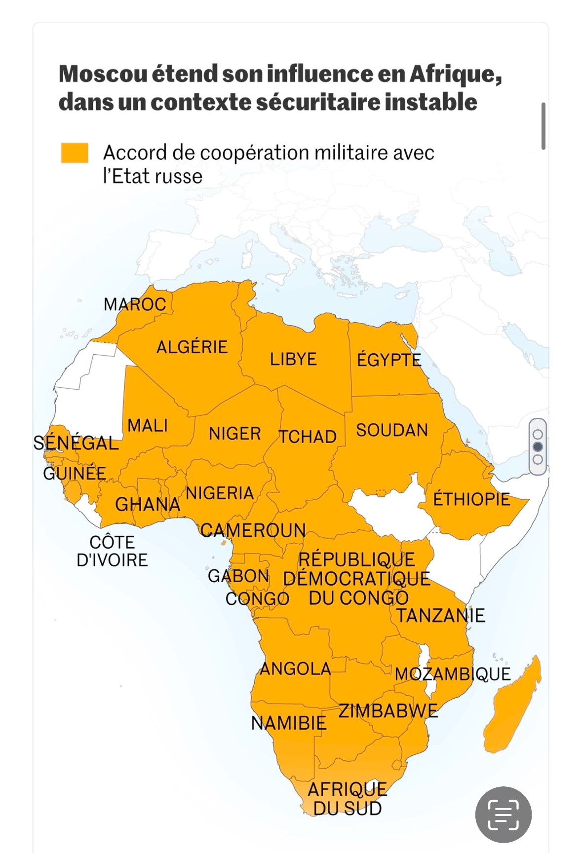 Sotto: in giallo gli stati africani che hanno un accordo di cooperazione militare con la Russia (2024).