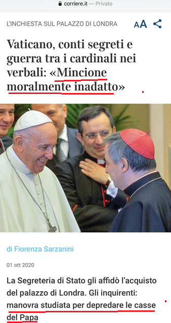 - La questione Raffaele Mincione. Su twitter abbiamo pubblicato un lungo articolo della Stampa. Il teorema Mincione e le sue derivate sono spiegate abbondantemente dal giornalista che ha redatto l’articolo e spiegato a voce in un filmato (leggi qui), forse il video oggi ha qualche problema perché non si vede), come del resto l’utilizzazione dei fondi Enasarco e Obolo di San Pietro. Sempre su Twitter abbiamo retwittato la lunga e un po’ convulsa intervista all’Adn-Kronos di Mincione, il quale spiega la sua versione (leggi qui).