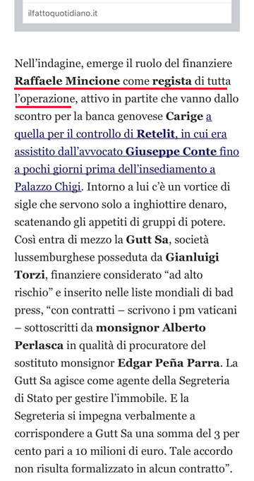 Ed è di questi giorni ( settembre- ottobre 2020) la “rivelazione” del fatto che Raffaele Mincione sarebbe “regista di tutta l’operazione” che riguarda il Vaticano, vedi Il Fatto Quotidiano, sotto.