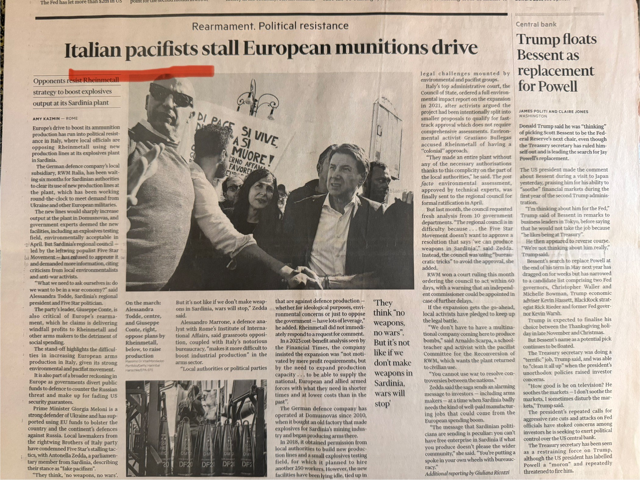 D’altronde l’Italia è il Paese che è riuscito a distinguersi in Europa per il suo “pacifismo”  (vedi articolo del Financial Times sotto) : il Movimento 5 Stelle, ad esempio, caso unico al mondo, blocca da mesi la fabbrica di munizioni della Rheinmetall in Sardegna, un’impianto che potrebbe dar lavoro a 250 operai.