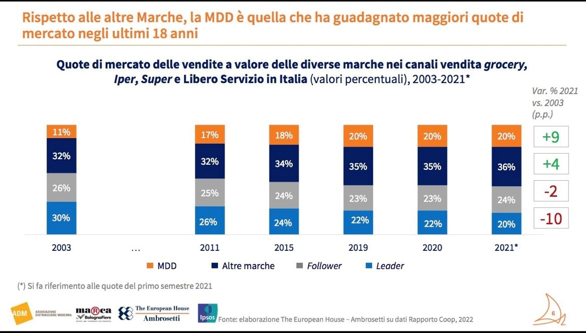 Negli ultimi 18 anni, in Italia, le marche leader hanno perso 10 punti di quota di mercato.