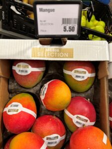 Sotto : i manghi Migros Selection, la gamma premium della cooperativa svizzera: una grande marca della distribuzione.