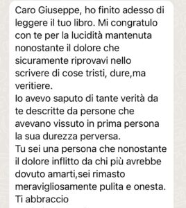 Caro Giuseppe, ho finito adesso di leggere il tuo libro. Mi congratulo con te per la lucidità mantenuta nonostante il dolore che sicuramente ri- provavi nello scrivere di cose tristi, dure, ma veritiere.