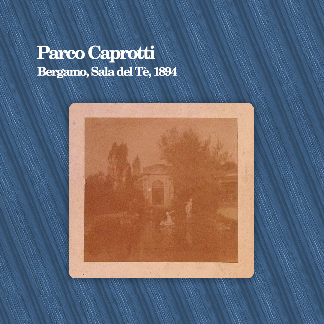 Come industriale e figura pubblica della società bergamasca, Carlo sceglie quale abitazione a Bergamo una signorile dimora nell’attuale via Tasso, con un grande parco di 5,61 pertiche (oltre 3600 mq.), studiato e organizzato da Carlo stesso. Il palazzo esiste ancora; sono rimaste fotografie degli interni d’epoca, arredate secondo l’opulento e affollato gusto di fine Ottocento, non senza richiami, nei quadri, a quel Risorgimento cui il giovanissimo Caprotti anelava tanto a prender parte, provandoci in effetti, ma rimanendone ai margini, profondamente deluso. E anche il parco esiste ancora, voluto da Carlo come giardino romantico all’inglese (ossia dove le specie arboree possono crescere in controllato disordine), recentemente restaurato e aperto al pubblico. Ancora si può vedere la cosiddetta “Sala del Tè”, un padiglione in stile neo-rinascimentale dove nella bella stagione si andava a ristorarsi e a conversare dopo una passeggiata, costruita nel 1890 sulla scorta di edifici simili (si veda ad esempio la Coffe House del parco di Villa Trotti-Bentivoglio a Verano Brianza, costruita più o meno alla stessa epoca). L’edificio è rimasto praticamente immutato nel tempo, come mostra una fotografia del mio archivio che porta sul recto la scritta “Primavera 1894”.