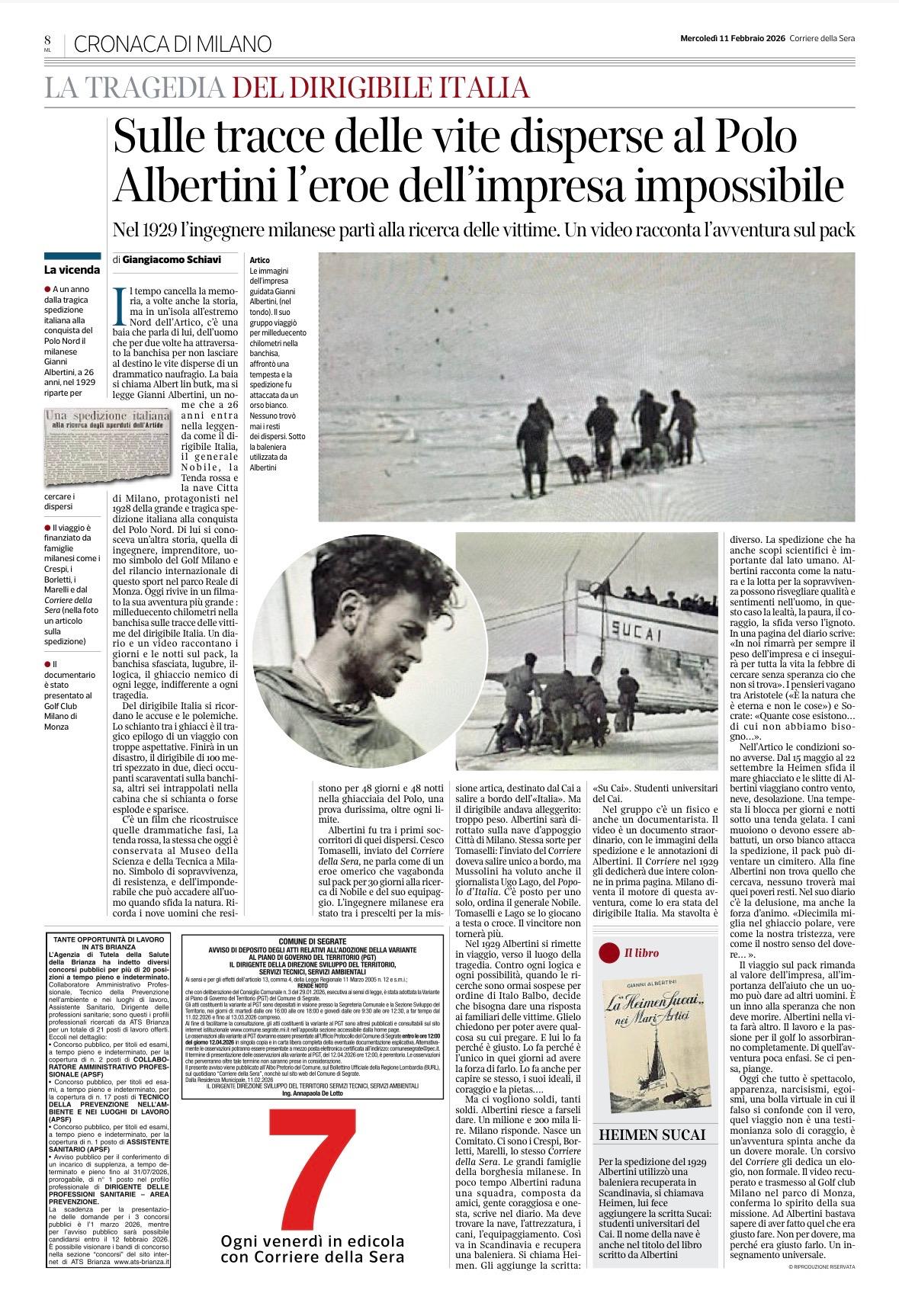 Albertini fu tra i primi soccorritori di quei dispersi. Cesco Tomaselli, inviato del Corriere della Sera, ne parla come di un eroe omerico che vagabonda sul pack per 30 giorni alla ricerca di Nobile e del suo equipaggio. L’ingegnere milanese era stato tra i prescelti per la missione artica, destinato dal Cai a salire a bordo dell’«Italia». Ma il dirigibile andava alleggerito: troppo peso. Albertini sarà dirottato sulla nave d’appoggio Città di Milano. Stessa sorte per Tomaselli: l’inviato del Corriere doveva salire unico a bordo, ma Mussolini ha voluto anche il giornalista Ugo Lago, del Popolo d’Italia. C’è posto per uno solo, ordina il generale Nobile. Tomaselli e Lago se lo giocano a testa o croce. Il vincitore non tornerà più.