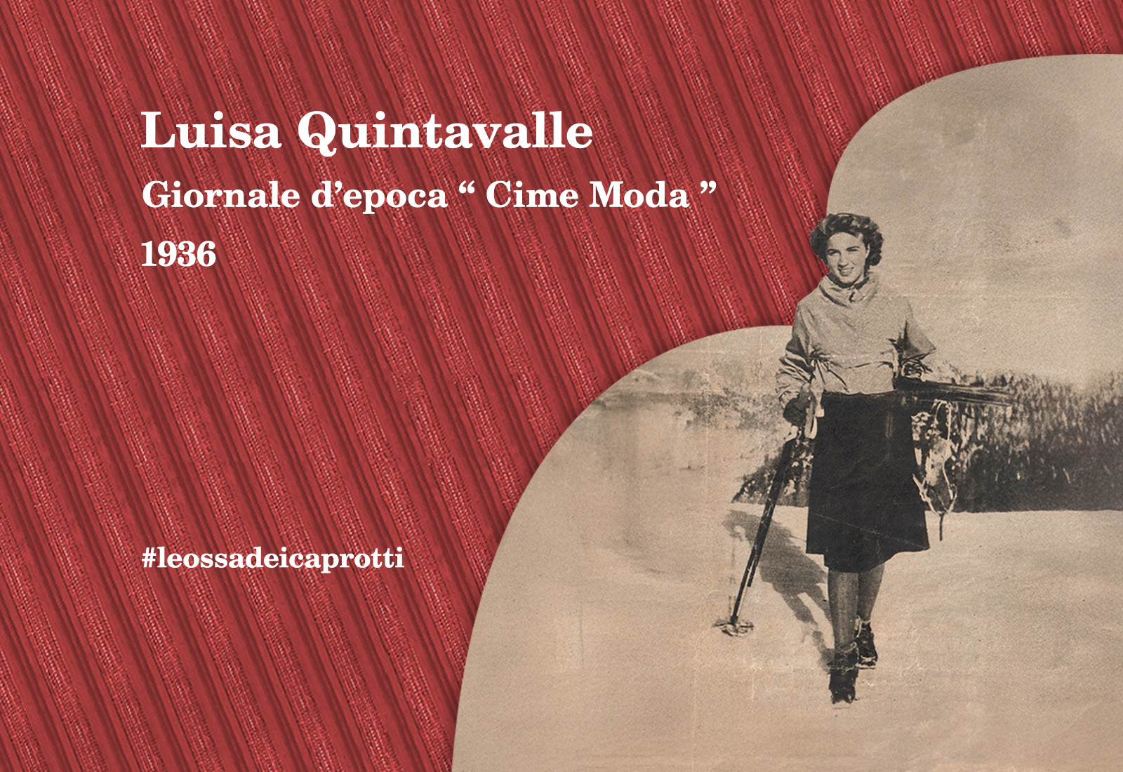 La nonna Luisa, oltre ad essere un’ottima sportiva, fu anche una protagonista della moda milanese. Dai ritagli di giornale conservati in archivio si legge come i rotocalchi nominassero spesso la signora Venosta, che si faceva notare per la sua fantasiosa eleganza sia che si parlasse di costumi da bagno sia di cappellini indossati a una prima della Scala. Qui è ritratta in un completo da montagna, di cui l’archivio conserva le foto di prova.