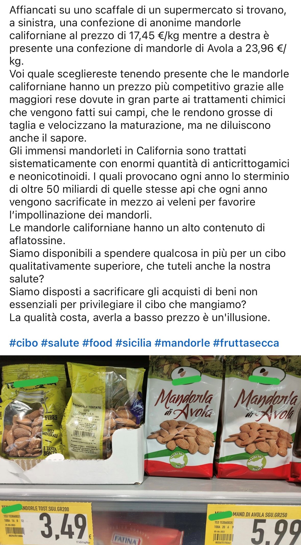 Tra le mandorle siciliane e le mandorle californiane v’è proprio… un oceano di differenze. Pesticidi, irrigazione artificiale e micotossine dall’altra parte del mondo, colture autoctone e lavorazioni tradizionali nella Magna Grecia.