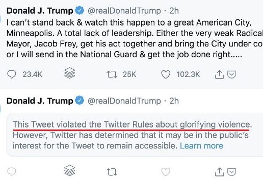 Sopra l’ultimo Tweet di Donald Trump del 29 maggio in cui Twitter segnala che Donald Trump glorifica la violenza (messaggio non eliminato)… A proposito dello strapotere delle società tecnologiche e del loro possibile cambiamento
