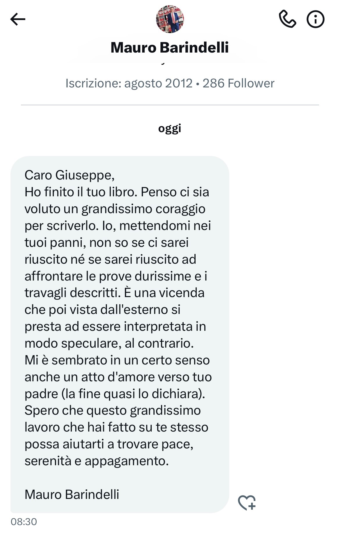 Caro Giuseppe, ho finito il tuo libro. Penso ci sia voluto un grandissimo coraggio per scriverlo. Io, mettendomi nei tuoi panni, non so se ci sarei riuscito ad affrontare le prove durissime e i travagli descritti. E’ una vicenda che poi vista dall’esterno si presta ad essere interpretata in modo speculare, al contrario. Mi è sembrato in un certo senso anche un atto d’amore verso tuo padre (la fine quasi lo dichiara). Spero che questo grandissimo lavoro che hai fatto su te stesso possa aiutarti a trovare pace, serenità e appagamento. Mauro Barindelli