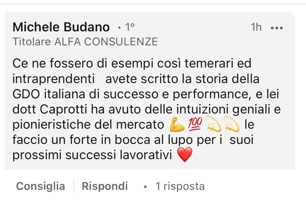 “Ce ne fossero di eempi così temerari ed intraprendenti. Avete scritto la storia della GDO italiana, di succeso e performance, e lei dottor Caprotti ha avuto intuizionì geniali e pionieristiche del mercato. Le faccio un forte in bocca al lupo per i suoi prossimi successi lavorativi”