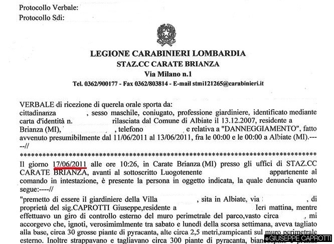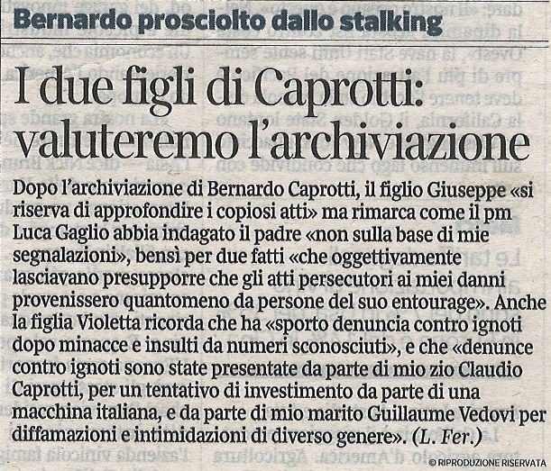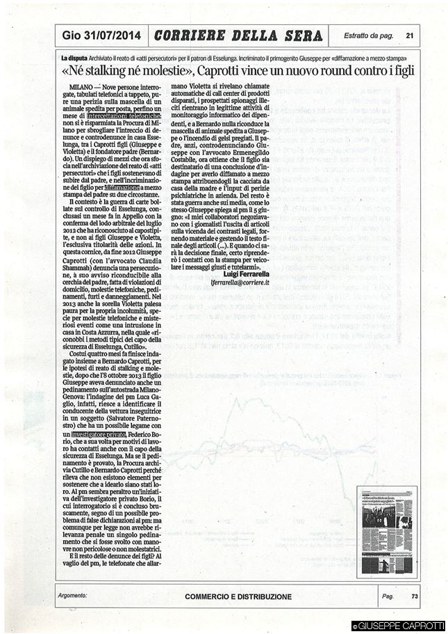 Il Corriere della Sera parla di Stalking “da fine 2012” ma i danneggiamenti contro le mie proprietà e le molestie alla mia persona sono iniziati nel giugno del 2011 (*), prima che iniziasse la disputa legale con Bernardo Caprotti