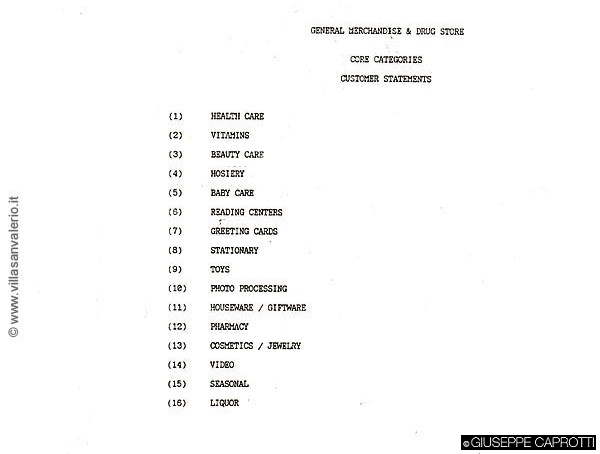 Riguardando e aggiornando Dai supermercati ai superstore 1. Gli inizi e il metodo. mi sono reso conto di non aver ben specificato le categorie prese in considerazione nel 1989 in Esselunga, al momento del lancio e della successiva concretizzazione del progetto.