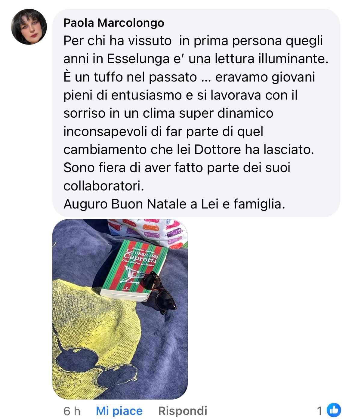 “Per chi ha vissuto in prima persona quegli anni in Esselunga è una lettura illuminante. E’ un tuffo nel passato… eravamo giovani, pieni di entusiasmo e si lavorava con il sorriso in un clima super dinamico, inconsapevoli di far parte di quel cambiamento che Lei Dottore ha lasciato. Sono fiera di aver fatto parte dei suoi collaboratori”