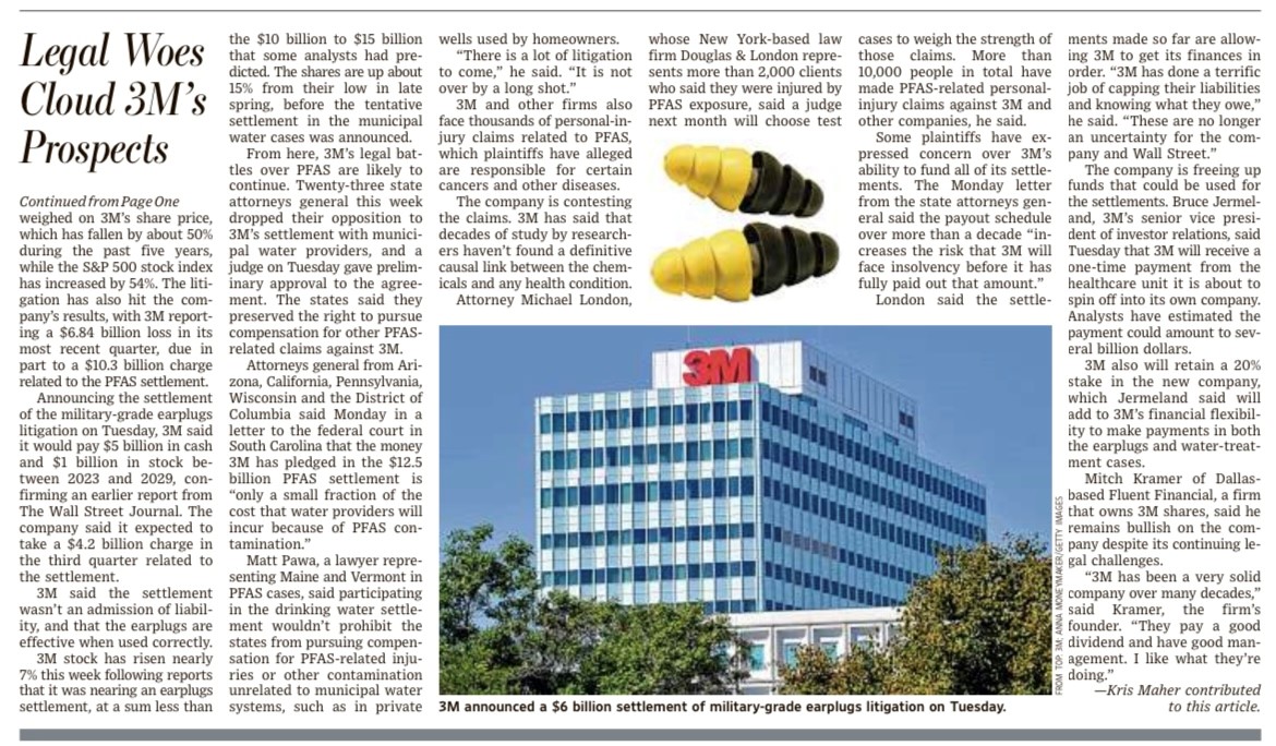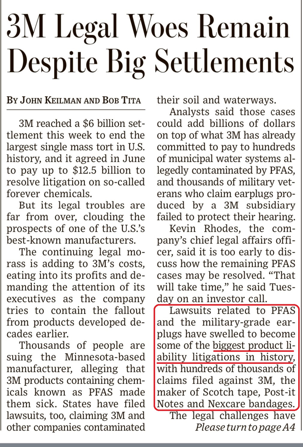 Nella realtà la situazione di 3M, negli USA (leggi il Wall Street Journal del 30 agosto 2023, sotto), è molto più complicata: probabilmente dovrà pagare una cifra pari a 10 miliardi di $ e subire cause da diversi stati americani per la qualità dell’acqua alterata dai suoi scarichi. Si prevede uno dei contenziosi (litigation) più grandi della storia, forse più ampio di quello in atto contro Bayer per il glifosato.
